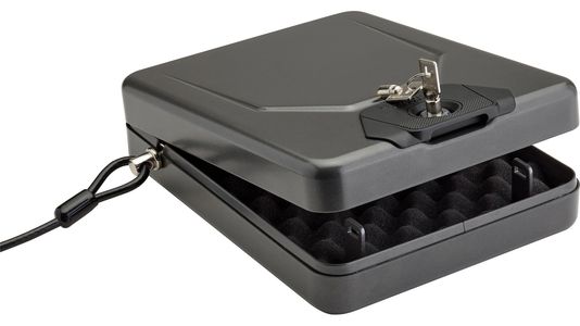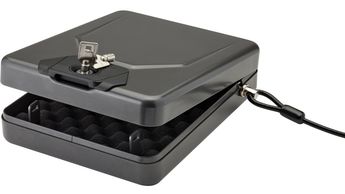 Heavy-duty construction and simple-opening design make our Keyed Safes ideal for securing your handgun or other valuables at home or away. The thick steel exterior keeps children and other unauthorized users out, while the foam lining prevents nicks or scratches. The 1,500-pound-rated cable provides additional security.